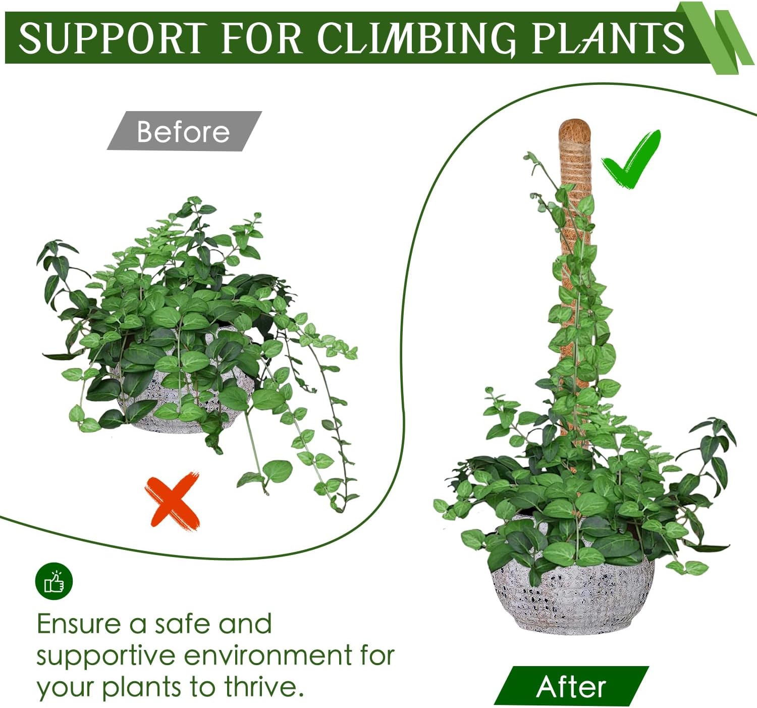 Reusable bendable moss pole with sturdy core lets you guide aerial roots and shape Monstera, Pothos, and Philodendron as they grow. Includes ties; easy to reposition without repotting.